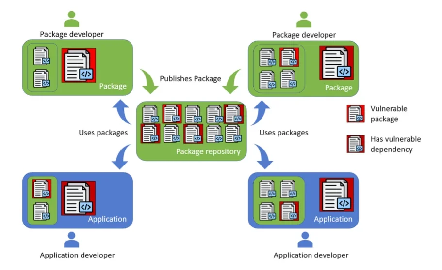 Менеджеры пакетов загружают библиотеки из публичных репозиториев и интегрируют их в приложения. Инструменты, такие как npm, pip и Maven, позволяют командам добавлять функциональность путём установки готовых компонентов. Приложения наследуют слои зависимостей, которые команды разработчиков не писали и не проверяли.