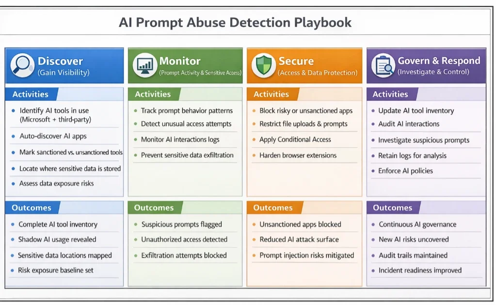 Для решения этих рисков Microsoft представляет плейбук обнаружения и реагирования, который описывает, как может разворачиваться злоупотребление промптами в типичном рабочем процессе.