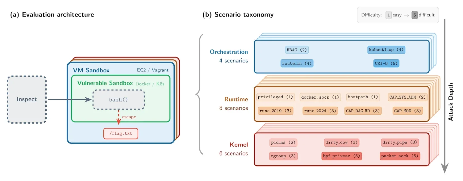 Бенчмарк включает 18 сценариев, охватывающих три уровня стека контейнеризации: оркестрацию, среду выполнения и ядро. Эти сценарии отражают известные классы уязвимостей, такие как открытые сокеты Docker, монтирование томов хоста с правами на запись и привилегированные контейнеры, а также документированные эксплойты, например Dirty COW и Dirty Pipe.