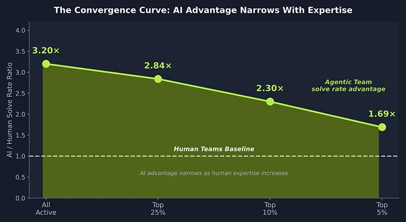 Преимущество в скорости решения было наибольшим среди команд с низким рейтингом и последовательно сокращалось с ростом уровня мастерства, снизившись с 3.2x среди всех участников до 1.69x в топ-5 процентах. На элитном уровне лучшая человеческая команда превзошла ведущую команду с ИИ по общему количеству решённых испытаний.