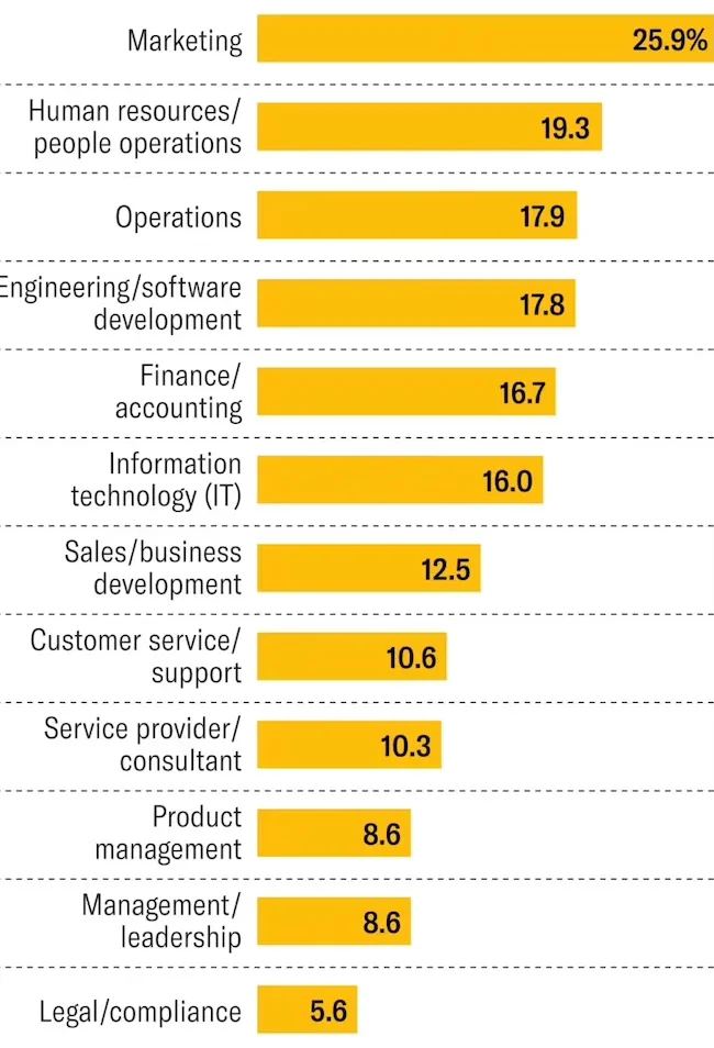 Юридические роли показали самую низкую распространённость. Маркетинговые роли — самую высокую. Отделы кадров, операционной деятельности, инженерии, финансов и ИТ также заняли высокие позиции по сравнению с другими функциями.