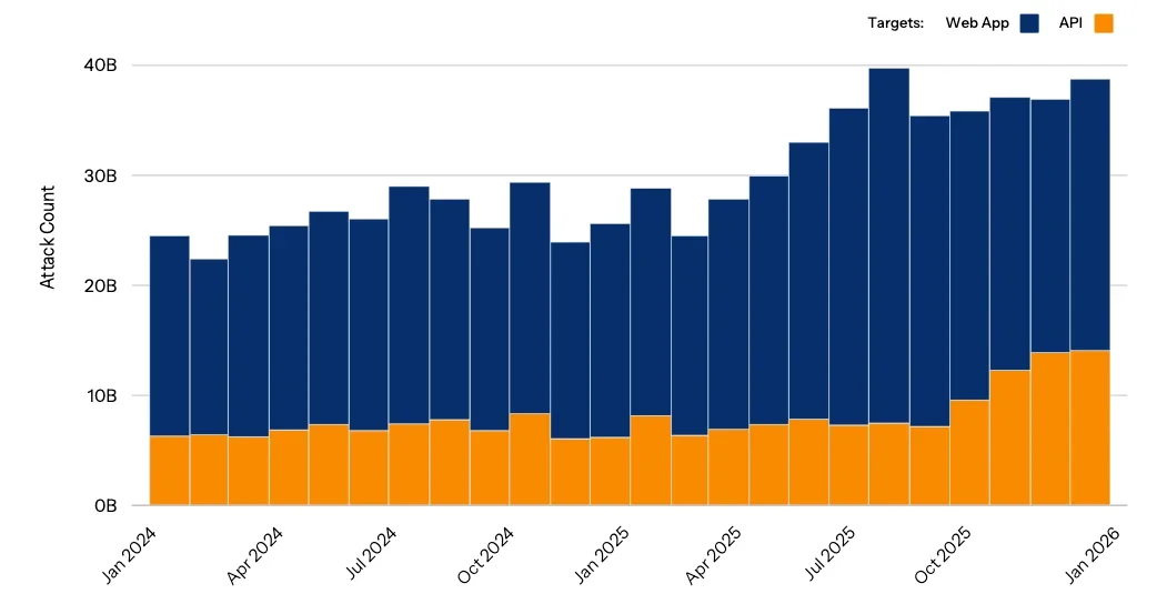 Количество веб-атак на приложения и API продолжало расти с января 2024 по декабрь 2025 года, что подтверждает их статус одной из главных угроз для организаций (Источник: Akamai)