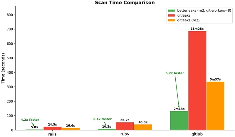 Сравнение времени сканирования с Gitleaks на реальных репозиториях (Источник: страница Betterleaks на GitHub)