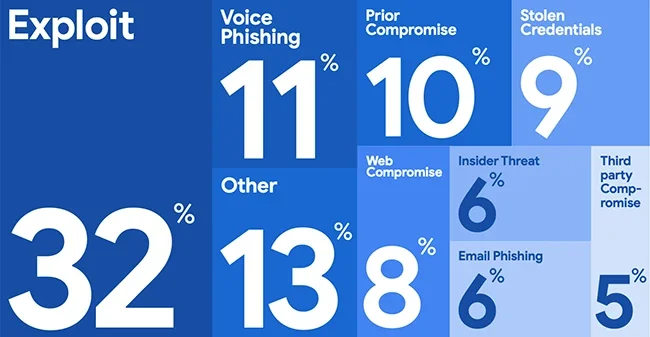 Голосовой фишинг стал вторым по распространённости первоначальным вектором заражения в 2025 году, фигурируя в 11% расследований Mandiant, где вектор удалось определить. Эксплойты остались на первом месте с 32%. Фишинг по электронной почте, который был доминирующим методом социальной инженерии всего несколько лет назад, демонстрирует устойчивое снижение и теперь составляет лишь малую часть от прежней доли.