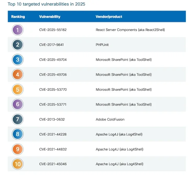 В то же время старые уязвимости оставались активными. Уязвимости Log4Shell оставались в десятке наиболее атакуемых, подчёркивая непрерывную эксплуатацию с 2021 года, поскольку Log4j по-прежнему встроен в корпоративные приложения, интеграции сторонних разработчиков, устаревшие системы и интернет-сервисы.