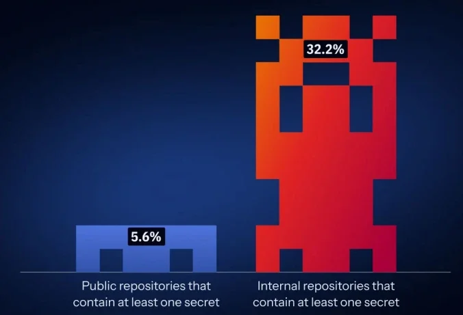 Проблема больше не существует только в публичных репозиториях, поскольку на внутренние среды приходится большая доля утекших учетных данных, часто напрямую связанных с производственными системами и операционным доступом. Внутренние репозитории демонстрируют гораздо более высокую вероятность содержания хардкодированных секретов, что приближает чувствительный доступ к ключевой инфраструктуре.