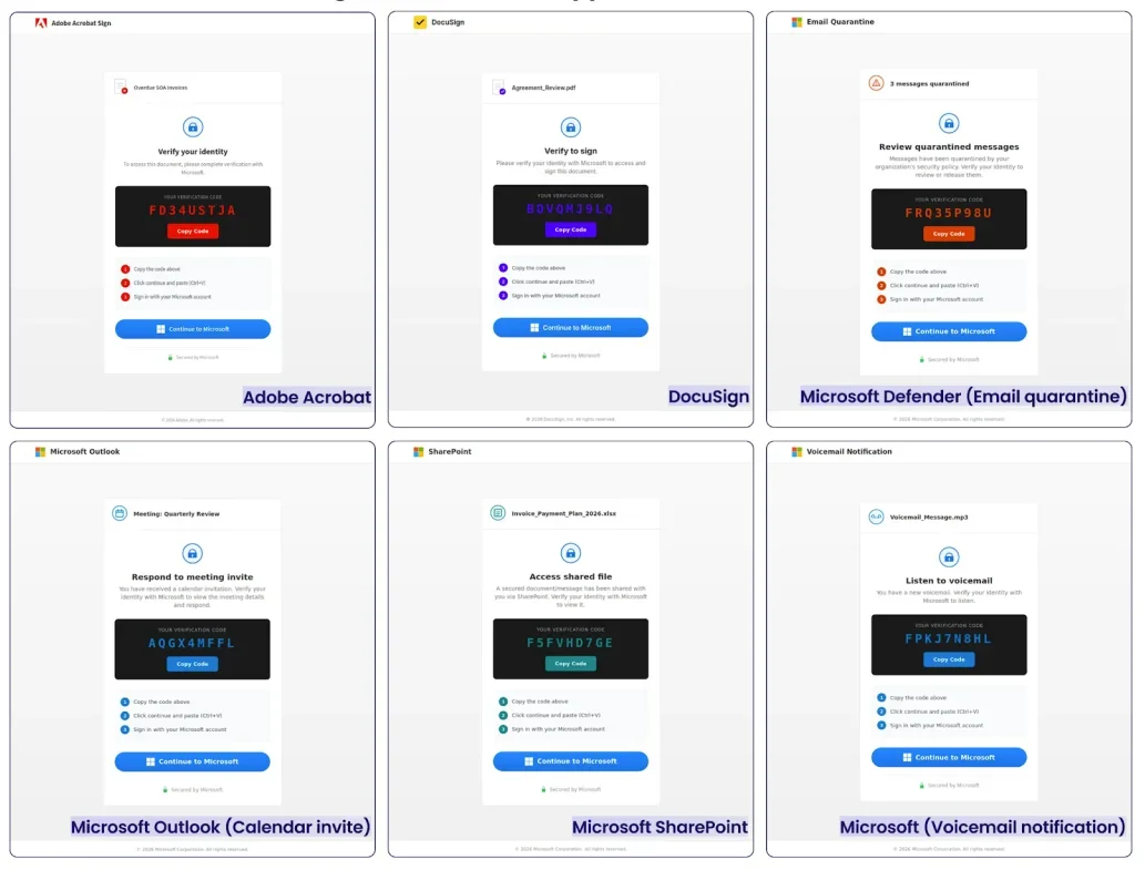 Шаблоны фишинговых писем EvilTokens включают уведомления о карантине почты, приглашения в календарь, запросы доступа к SharePoint, предупреждения об истечении срока действия пароля, запросы DocuSign и Adobe Acrobat Sign, уведомления об общих документах в OneDrive и уведомления eFax.