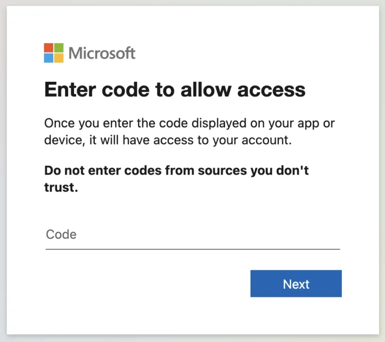 Корпорация Microsoft предоставляет рабочий процесс аутентификации по коду устройства, чтобы помочь пользователям «войти на устройства с ограниченными возможностями ввода, такие как смарт-телевизор, устройство Интернета вещей или принтер».