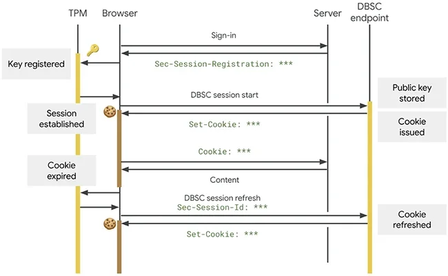 Обзор протокола DBSC, показывающий взаимодействие между браузером и сервером (Источник: Google)