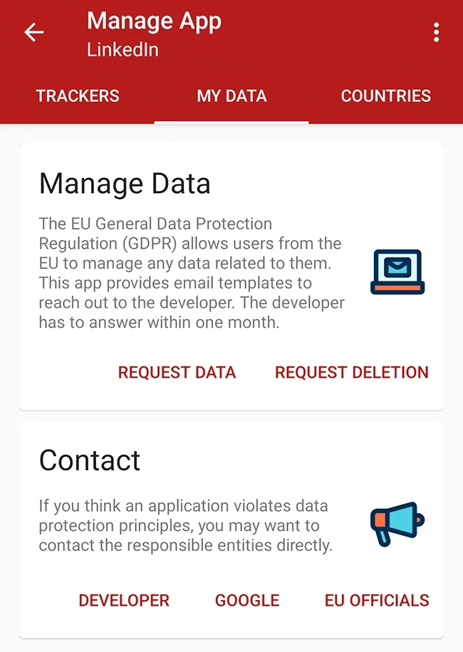 TrackerControl также предоставляет познавательную информацию о правах на приватность, включая сведения о законах о защите данных, таких как GDPR. Это помогает пользователям принимать осознанные решения об устанавливаемых приложениях и разрешаемых потоках данных.